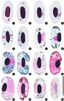 - Multiple pigment granules (hemozoin) are present within the erythrocytes