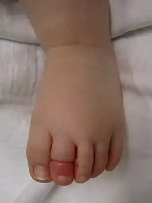 Hair tourniquet is a condition where hair or thread becomes tightly wrapped around most commonly a toe, and occasionally a finger, genitals, or other body parts.[1] This results in pain and swelling of the affected part.[1] Complications can include tissue death due to lack of blood flow.[1] It occurs most commonly among children around 4 months of age,[1] though cases have been described in older children and adults.[2]