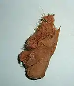 A hairball is a small collection of hair or fur formed in the stomach of animals, and uncommonly in humans, that is occasionally vomited up when it becomes too big. Hairballs are primarily a tight elongated cylinder of packed fur, but may include bits of other elements such as swallowed food. Animals with hairballs are sometimes mistaken as having other conditions of the stomach such as lymphosarcoma, tuberculosis, and tumor of the spleen.[1] Cats are especially prone to hairball formation since they groom themselves by licking their fur, and thereby ingest it. Rabbits are also prone to hairballs because they groom themselves in the same fashion as cats, but hairballs are especially dangerous for rabbits because they cannot regurgitate them. Due to the fragility of their digestive systems, hairballs in rabbits must be treated immediately or they may stop feeding and ultimately die from dehydration. Cattle are also known to accumulate hairballs but, as they do not vomit, these are found usually after death and can be quite large.