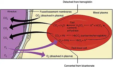 In addition to enhancing removal of carbon dioxide from oxygen-consuming tissues, the Haldane effect promotes dissociation of carbon dioxide from hemoglobin in the presence of oxygen. In the oxygen-rich capillaries of the lung, this property causes the displacement of carbon dioxide to plasma as low-oxygen blood enters the alveolus and is vital for alveolar gas exchange.