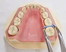 The stainless steel crowns are selected by tooth type, location and size (see image 2). The tooth will be measured to identify the most suitable size of stainless steel crown.[25] The clinician will try the stainless steel crown prior to its cementation, to ensure that it fits correctly, and establish if an alternative size or contouring of the stainless steel crown is required. When placing the stainless steel crown within the mouth, the airways will generally be protected by placing gauze around the site, or the clinician may secure the stainless steel with tape/Elastoplast.[25] Once a correct size/fit is established, the crown may be adhered to the tooth. The stainless steel crown is secured to the tooth by partially filling the stainless steel crown with a self curing glass ionomer cement and then placing over the tooth.[25] The stainless steel crown should "click" securely into place.[25] The patient is required to bite firmly onto a cotton roll or bite stick to secure it in the correct position whilst it sets.[25] The excess of glass ionomer cement will be wiped off or removed with knotted floss from between the interproximal contact, and a sickle probe from the buccal gingival sulcus on the buccal and lingual/palatal surfaces.[21]