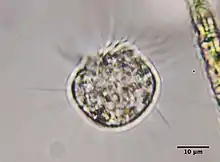 The genus Halteria consists of freshwater ciliates that typically live a planktonic lifestyle. The species Halteria grandinella is considered cosmopolitan, meaning that it is found in habitats across the world.[13] Other species are less common and so they are less well defined, however frequent descriptions of Halteria grandinella have provided insight into the genus as a whole. Halteria are heterotrophic and unlike many closely related genera like Pelagohalteria, they have no photosynthetic endosymbionts. Halteria do frequently eat green algae which, when observed in food vacuoles, has led to misclassifications in the past when mistaken for endosymbionts.[14]