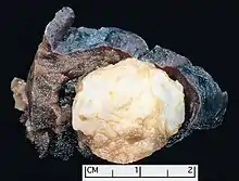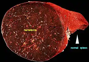 | A large hamartoma of the spleen. The hamartoma is the dark circular object on the left that dominates the image. This is a cross-section; the growth is about 9 cm in diameter, while the entire spleen is about 11 cm in diameter.[1] | |