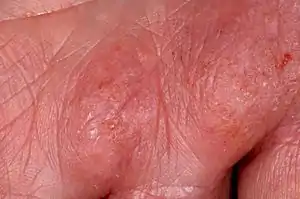 Hand eczema presents on the palms and soles, and may sometimes be difficult or impossible to differentiate from atopic dermatitis, allergic contact dermatitis, and psoriasis, which also commonly involve the hands.[1]: 78 Even a biopsy of all these conditions may not result in a definitive diagnosis, as all three conditions may demonstrate spongiosis and crusting on the hands.[1]: 78