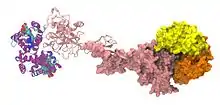 Haptoglobin (abbreviated as Hp) is the protein that in humans is encoded by the HP gene.[5][6] In blood plasma, haptoglobin binds with high affinity to free hemoglobin[7] released from erythrocytes, and thereby inhibits its deleterious oxidative activity. Compared to Hp, hemopexin binds to free heme.[8] The haptoglobin-hemoglobin complex will then be removed by the reticuloendothelial system (mostly the spleen).