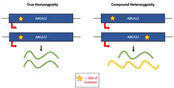 Harlequin-type ichthyosis is caused by mutations in the ABCA12 gene.[4] This gene codes for a protein necessary for transporting lipids out of cells in the outermost layer of skin.[4] The disorder is autosomal recessive and inherited from parents who are carriers.[4] Diagnosis is often based on appearance at birth and confirmed by genetic testing.[5] Before birth, amniocentesis or ultrasound may support the diagnosis.[5]