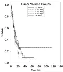 Kaplan-Meier curve illustrating overall survival based on volume of brain metastases. Elaimy et al. (2011)[6]