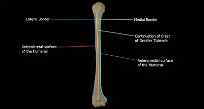 • Anteromedial surface: the area between the medial border of the humerus to the line drawn as a continuation of the crest of the greater tubercle. The antero-medial surface, less extensive than the antero-lateral, is directed medialward above, forward and medialward below; its upper part is narrow, and forms the floor of the intertubercular groove which gives insertion to the tendon of the latissimus dorsi muscle; its middle part is slightly rough for the attachment of some of the fibers of the tendon of insertion of the coracobrachialis muscle; its lower part is smooth, concave from above downward, and gives origin to the brachialis muscle.