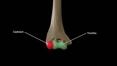 Capitulum on the lateral side and trochlea on the medial side of the Humerus