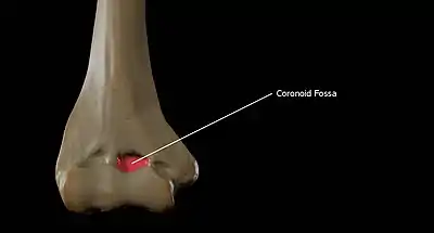 Above the front part of the trochlea is a small depression, the coronoid fossa, which receives the coronoid process of the ulna during flexion of the forearm.