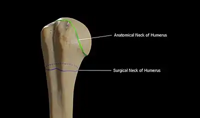 The head (caput humeri), is nearly hemispherical in form. It is directed upward, medialward, and a little backward, and articulates with the glenoid cavity of the scapula to form the glenohumeral joint (shoulder joint). The circumference of its articular surface is slightly constricted and is termed the anatomical neck, in contradistinction to a constriction below the tubercles called the surgical neck which is frequently the seat of fracture. Fracture of the anatomical neck rarely occurs.[2] The diameter of the humeral head is generally larger in men than in women.
