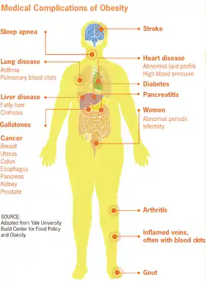 Health at Every Size (HAES) is an approach to public health that seeks to downplay weight loss as a health goal, and reduce stigma towards people who are overweight or obese.[1] Proponents argue that traditional interventions focused on weight loss, such as dieting, do not reliably produce positive health outcomes, and that health is a result of lifestyle behaviors that can be performed independently of body weight.[2] However, many criticize the approach and argue that weight loss should sometimes be an explicit goal of healthcare interventions, because of the negative health outcomes associated with obesity.[3]