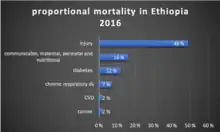 Tobacco use is the major single known risk factor for non-communicable diseases from the four listed main risk factors (diet, physical activity, and harmful use of alcohol).[33] NCDs are the leading cause of premature death and disability in Ethiopia accounts for about 42% of deaths, of which 27% are premature deaths before 70 years of age.[34] NCDs are estimated to account for 39% of all deaths in Ethiopia, while 71% in the world. Recently, the burden of these diseases is rising rapidly among populations in the low-income countries.[35]