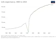 People in Japan have the longest life expectancy at birth of those in any country in the world. Life expectancy at birth was 83 years in 2009 (male 79.6 years, female 86.4 years).[7] This was achieved in a fairly short time through a rapid reduction in mortality rates secondary to communicable diseases from the 1950s to the early 1960s, followed by a large reduction in stroke mortality rates after the mid-60s.[15]