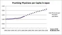 In 2008 per 1000 population, the number of practicing physicians was 2.2, which was almost the same as that in U.S. (2.4), and the number of practicing nurses was 9.5, which was a little lower than that in U.S. (10.8), and almost the same as that in UK (9.5) or in Canada (9.2).[7] Physicians and nurses are licensed for life with no requirement for license renewal, continuing medical or nursing education, and no peer or utilization review.[18] OECD data lists specialists and generalists together for Japan[7] because these two are not officially differentiated. Traditionally, physicians have been trained to become subspecialists,[19] but once they have completed their training, only a few have continued to practice as subspecialists. The rest have left the large hospitals to practice in small community hospitals or open their own clinics without any formal retraining as general practitioners.[8] Unlike many countries, there is no system of general practitioners in Japan, instead patients go straight to specialists, often working in clinics.