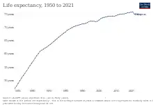 Malaysia has a widespread system of health care. It implements a universal healthcare system, which exists alongside the private healthcare system.[1] Infant mortality rate – a standard in determining the overall efficiency of healthcare – in 2005 was 10, comparing favourably with the United States and western Europe. Life expectancy at birth in 2005 was 74 years.[2] Infant mortality fell from 75 per 1000 live births in 1957 to 7 in 2013.[3]