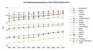 2. "OECD.StatExtracts, Health, Health Status, Life expectancy, Total population at birth, 2011" (Online Statistics). OECD.Stats. OECD's iLibrary. 2013. Retrieved 22 November 2013.