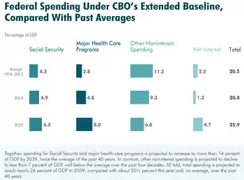The non-partisan Congressional Budget Office (CBO) reported in March 2017 that healthcare cost inflation and an aging population are primary drivers of increasing budget deficits over time, as outlays (spending) continue to rise faster than revenues relative to GDP. CBO forecast that spending on major healthcare programs (including Medicare and Medicaid) would rise from 5.5% GDP in 2017 to 9.2% GDP by 2047.[14]