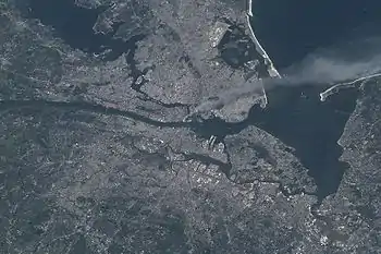 International Space Station image taken on September 11, 2001, with the smoke plume rising from Lower Manhattan and extending over Brooklyn (Expedition 3 crew)