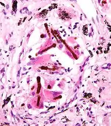 There is experimental evidence that very slim fibers (<60 nm, <0.06 μm in breadth) tangle destructively with chromosomes (being of comparable size).[27][28] This is likely to cause the sort of mitosis disruption expected in cancer.
