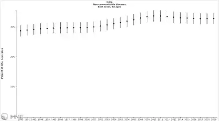 Starting in early 1990s, there have been wide disparities in terms of NCD burden on Indian diaspora. While life expectancy has increased it is the number of years lost due to ill-health, disability or early death (DALY) rate that is almost doubled. It was 29.17% in 1990 and reached 57.92% in 2019 according to IHME. Also NCDs are accounting for more than 90% of total prevalent cases in India at any given point of time. Between ages 15–49 NCDs mortality share was 35.56% in 1990 while the share is increased to 48.95% in 2019[26]