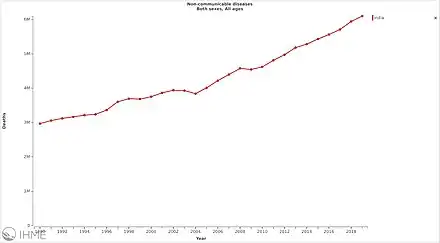 The burden of the Non-Communicable Diseases (NCD) in India with a population of the over 1.3 billion is huge. NCDs in India contributed to 6.8 million deaths in 2019, which is about 67.6% percent of overall deaths. In the same year Ischemic heart disease accounted for highest mortality followed by COPD, Stroke and Diabetes among all NCD related deaths.[25]
