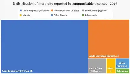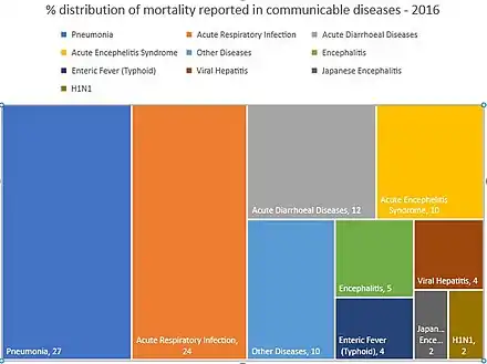 Approximately 1.72 million children die each year before turning one.[31] The under five mortality and infant mortality rates have been declining, from 202 and 190 deaths per thousand live births respectively in 1970 to 64 and 50 deaths per thousand live births respectively in 2009 and to 41.1 (in 2018) and 34.6 (in 2016) deaths per thousand live births respectively.[31][32][4] However, this decline is slowing. Reduced funding for immunization leaves only 43.5% of the young fully immunized.[33] A study conducted by the Future Health Systems Consortium in Murshidabad, West Bengal indicates that barriers to immunization coverage are adverse geographic location, absent or inadequately trained health workers and low perceived need for immunization.[34] Infrastructure like hospitals, roads, water and sanitation are lacking in rural areas.[35] Shortages of healthcare providers, poor intrapartum and newborn care, diarrheal diseases and acute respiratory infections also contribute to the high infant mortality rate.[31]