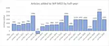 As of the end of 2013, the English Wikipedia had 29,072 medical articles, while across all language versions of Wikipedia, there were 155,805 medical articles.[4] As of March 2017, the English Wikipedia had 30,000 medical articles, while there were 164,000 medical articles in other languages.[5] As of 2017, there were about 6,000 anatomy articles on the English Wikipedia;[6] these are not classified as "medical articles" in Wikipedia's categorization scheme and thus are not included in the 30,000 figure above.[4]
