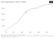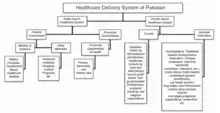 The healthcare delivery system of Pakistan (تحفّظ صحتِ عامّہ ، پاکستان) is complex because it includes healthcare subsystems by federal governments and provincial governments competing with formal and informal private sector healthcare systems.[3][2] Healthcare is delivered mainly through vertically managed disease-specific mechanisms. The different institutions that are responsible for this include: provincial and district health departments, parastatal organizations, social security institutions, non-governmental organizations (NGOs) and private sector.[4] The country's health sector is also marked by urban-rural disparities in healthcare delivery and an imbalance in the health workforce, with insufficient health managers, nurses, paramedics and skilled birth attendants in the peripheral areas.[5][6] Pakistan's gross national income per capita in 2021 was $4,990 and the total expenditure on health per capita in 2021 was Rs 657.2 Billion, constituting 1.4% of the country's GDP.[7] The health care delivery system in Pakistan consists of public and private sectors. Under the constitution, health is primarily responsibility of the provincial government, except in the federally administrated areas. Health care delivery has traditionally been jointly administered by the federal and provincial governments with districts mainly responsible for implementation. Service delivery is being organized through preventive, promotive, curative and rehabilitative services. The curative and rehabilitative services are being provided mainly at the secondary and tertiary care facilities. Preventive and promotive services, on the other hand, are mainly provided through various national programs; and community health workers’ interfacing with the communities through primary healthcare facilities and outreach activities. The state provides healthcare through a three-tiered healthcare delivery system and a range of public health interventions. Some government/ semi government organizations like the armed forces, Sui Gas, WAPDA, Railways, Fauji Foundation, Employees Social Security Institution and NUST provide health service to their employees and their dependents through their own system, however, these collectively cover about 10% of the population. The private health sector constitutes a diverse group of doctors, nurses, pharmacists, traditional healers, drug vendors, as well as laboratory technicians, shopkeepers and unqualified practitioners.