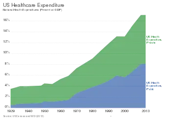 Aggregate US hospital costs were $387.3 billion in 2011—a 63% increase since 1997 (inflation adjusted). Costs per stay increased 47% since 1997, averaging $10,000 in 2011 (equivalent to $13,009 in 2022[25]).[111] As of 2008, public spending accounts for between 45% and 56% of US healthcare spending.[112] Surgical, injury, and maternal and neonatal health hospital visit costs increased by more than 2% each year from 2003–2011. Further, while average hospital discharges remained stable, hospital costs rose from $9,100 in 2003 (equivalent to $14,476 in 2022[25]) to $10,600 in 2011 (equivalent to $13,789 in 2022[25]) and were projected to be $11,000 by 2013 (equivalent to $13,819 in 2022[25]).[113]