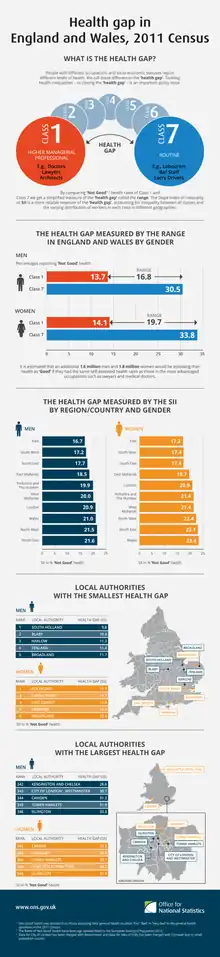 Along with the socioeconomic factor of health disparities, race is another key factor. The United States historically had large disparities in health and access to adequate healthcare between races, and current evidence supports the notion that these racially centered disparities continue to exist and are a significant social health issue.[45][46] The disparities in access to adequate healthcare include differences in the quality of care based on race and overall insurance coverage based on race. A 2002 study in the Journal of the American Medical Association identifies race as a significant determinant in the level of quality of care, with blacks receiving lower quality care than their white counterparts.[47] This is in part because members of ethnic minorities such as African Americans are either earning low incomes, or living below the poverty line. In a 2007 Census Bureau, African American families made an average of $33,916, while their white counterparts made an average of $54,920.[48] Due to a lack of affordable health care, the African American death rate reveals that African Americans have a higher rate of dying from treatable or preventable causes. According to a study conducted in 2005 by the Office of Minority Health—a U.S. Department of Health—African American men were 30% more likely than white men to die from heart disease.[48] Also African American women were 34% more likely to die from breast cancer than their white counterparts.[48] Additionally, among African American and Latino infants, mortality rates are 2 to 3 times higher than other racial groups.[49] An analysis of more than 2 million pregnancies found that babies born to Black women worldwide had poorer outcomes (such as baby death and stillbirth) than White women. This was true even after controlling for older age and a lower level of education among mothers (an indicator of poorer economic and social status). In the same analysis, Hispanic women were 3 times more likely to experience a baby death than White women and South Asian women had an increased risk of premature birth and having a baby with low birthweight compared with White women.[50][51]