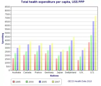 The United States spends a higher proportion of its GDP on healthcare (19%) than any other country in the world, except for East Timor (Timor-Leste).[26] The number of employers who offer health insurance is declining. Costs for employer-paid health insurance are rising rapidly: since 2001, premiums for family coverage have increased 78%, while wages have risen 19% and prices have risen 17%, according to a 2007 study by the Kaiser Family Foundation.[27]