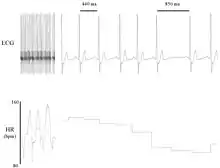- Respiratory arrhythmia (or respiratory sinus arrhythmia).[34][35] This heart rate variation is associated with respiration and faithfully tracks the respiratory rate across a range of frequencies.