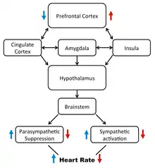 The neurovisceral integration is a model of HRV that views the central autonomic network as the decision maker of cognitive, behavioral and physiological regulation as they pertain to a continuum of emotion.[14] The neurovisceral integration model describes how the prefrontal cortex regulates activity in limbic structures which act to suppress parasympathetic nervous system (PSNS) activity and activate sympathetic nervous system (SNS) circuits.[15] Variation in the output of these two branches of the autonomic system produces HRV[16] and activity in the prefrontal cortex can hence modulate HRV.[17]