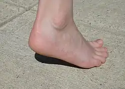 The heel is the prominence at the posterior end of the foot. It is based on the projection of one bone, the calcaneus or heel bone, behind the articulation of the bones of the lower leg.