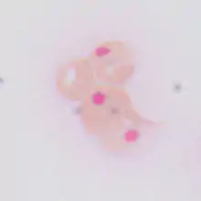 Heinz bodies (also referred to as "Heinz-Ehrlich bodies") are inclusions within red blood cells composed of denatured hemoglobin.[1][2] They are not visible with routine blood staining techniques, but can be seen with supravital staining. The presence of Heinz bodies represents damage to hemoglobin and is classically observed in G6PD deficiency, a genetic disorder that causes hemolytic anemia. In veterinary medicine, Heinz bodies may be seen following the consumption of foods containing thiosulfate and propylene glycol compounds by cats, dogs and certain primates.