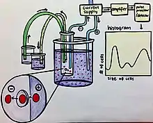 A 3-part differential cell counter uses Coulter's Principle to find the size and volume of the cell. The sample is lysed and dissolved into an electrolyte solution in a container, which also holds a smaller container. The smaller container has 2 pumps running to and from its solution, one creating a vacuum and the other replacing the lost solution. The smaller container has a small hole (an orifice) near the bottom of the container. Coulter's principle is applied through the use of two electrodes. One electrode (the internal electrode) is within the smaller container, and the other (the external electrode) is outside of the smaller container but within the electrolyte/sample solution. As the vacuum draws the sample cells through the orifice, the cell momentarily causes electrical resistance to the current as it passes through the orifice. This resistance is recorded, measured, amplified, and processed which can then be interpreted by the computer into a histogram. The 3-part analyzer is able to differentiate between 3 types of WBC's, neutrophils, lymphocytes, and monocytes.[7]