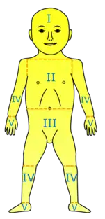 In both newborns and adults, yellowing of the skin is a marker for jaundice.[27] As most cases of jaundice are observed in newborns, healthcare workers use visual methods to identify the presence of this condition.[29] A clinical jaundice scale, an adapted version of the Kramer's scale, is used to quantify the severity of jaundice through the spread of skin discoloration from zone 1, the head, to zone 5, the palms and soles of the neonate's body.[29][30] Cephalocaudal progression of jaundice to zone 4 and 5 of the Kramer's scale shows a significant positive correlation with serum bilirubin concentration of at least 11.0 mg per 100 ml, indicating the need for treatment.[29]