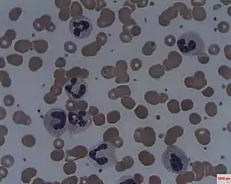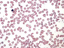 Blood smear of a patient with Thrombotic Thrombocytopenic Purpura (TTP). Notice that some red blood cells are nucleated. This is a characteristic finding in such blood smears. - Autoimmune hemolytic anemia (AIHA), in which autoantibodies react with self red blood cells and cause their destruction.[5] This disease is marked by increased extravascular hemolysis, with laboratory findings including increased lactate dehydrogenase and decreased or absent haptoglobin in both warm and cold AIHA, and positive Coombs test.[5] Clinically, jaundice or dark urine present in approximately one-third of the cases, and most of the symptoms are related to anemia.[5]