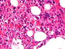 | Micrograph showing red blood cells within macrophages. H&E stain. | |