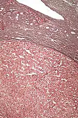 | Micrograph of a hepatic adenoma (bottom of image). H&E stain | |