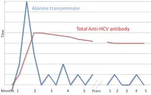 About 70% of those exposed to the virus develop a chronic infection.[4] This is defined as the presence of detectable viral replication for at least six months. Though most experience minimal or no symptoms during the initial few decades of a chronic infection,[18] chronic hepatitis C can be associated with fatigue[19] and mild cognitive problems.[20] After several years, chronic infection may cause cirrhosis or liver cancer.[5] The liver enzymes measured from blood samples are normal in 7–53%.[21] (Elevated levels indicate liver cells are being damaged by the virus or other disease). Late relapses after apparent cure have been reported, but these can be difficult to distinguish from reinfection.[21]