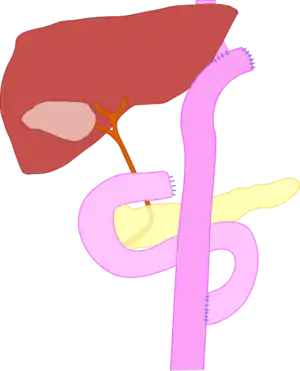 | Diagram demonstrating the end result of a total gastrectomy, the most common prophylactic treatment of HDGC. In the procedure the esophagus is directly connected to the small intestine. | |