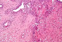 Upper Endoscopy often reveals ulcers throughout the esophagus with intervening normal-appearing mucosa. In severe cases the ulcers can coalesce and on rare occasions have a black appearance known as black esophagus.[8] While the diagnosis of herpes esophagitis can be inferred clinically it can only be accurately diagnosed through endoscopically obtained biopsies with microscopic evaluation by a pathologist finding the appropriate inclusion bodies and diagnostic immunochemical staining.[9] False negative findings may occur if biopsies are taken from the ulcer rather than from the margin of the ulcer as the inclusion particles are to be found in viable epithelial cells. Viral tissue culture represents the most accurate means of diagnosing the precise cause.