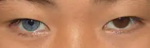 Heterochromia is a variation in coloration. The term is most often used to describe color differences of the iris, but can also be applied to color variation of hair[1] or skin. Heterochromia is determined by the production, delivery, and concentration of melanin (a pigment). It may be inherited, or caused by genetic mosaicism, chimerism, disease, or injury.[2] It occurs in humans and certain breeds of domesticated animals.