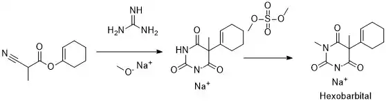 Hexobarbital can be synthesised by reacting methyl (cyclohexen-1-yl) cyanoacetate with guanidine and sodium methylate. A hexobarbital sodium precursor is then formed which can be methylated with dimethyl sulphate.[10]