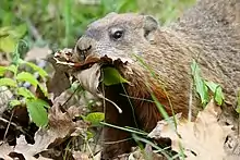 Groundhog gathering nesting material for its warm burrow in preparation for hibernation