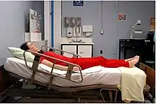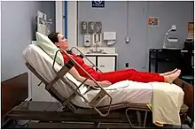 The Semi-Fowler's position is a position in which a patient, typically in a hospital or nursing home in positioned on their back with the head and trunk raised to between 15 and 45 degrees,[4] although 30 degrees is the most frequently used bed angle.[5][6] The elevation is less than that of the Fowler's position, and may include the foot of the bed being raised at the knee to bend the legs.The position is useful in promoting lung expansion[7] as gravity pulls the diaphragm downward, allowing for expansion and ventilation.[4] It is also recommended during gastric feeding to reduce the risk of regurgitation and aspiration.[4] During childbirth, the semi-Fowler's position is preferred over the full-Fowler's as it is generally more comfortable for the mother, and reduces the need for analgesics and surgical interventions such as operative vaginal delivery or cesarean sections.[8] The semi-Fowler's position is also indicated when assessing the jugular veins.[7]