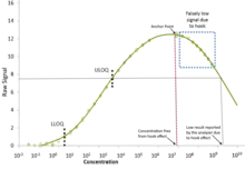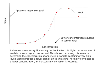 The hook effect refers to the prozone phenomenon, also known as antibody excess or the Postzone phenomenon, also known as antigen excess. It is an immunologic phenomenon whereby the effectiveness of antibodies to form immune complexes can be impaired when concentrations of an antibody or an antigen are very high. The formation of immune complexes stops increasing with greater concentrations and then decreases at extremely high concentrations, producing a hook shape on a graph of measurements. An important practical relevance of the phenomenon is as a type of interference that plagues certain immunoassays and nephelometric assays, resulting in false negatives or inaccurately low results. Other common forms of interference include antibody interference, cross-reactivity and signal interference. The phenomenon is caused by very high concentrations of a particular analyte or antibody and is most prevalent in one-step (sandwich) immunoassays.[2][3]