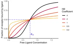 Binding curves showing the characteristically sigmoidal curves generated by using the Hill–Langmuir equation to model cooperative binding. Each curve corresponds to a different Hill coefficient, labeled to the curve's right. The vertical axis displays the proportion of the total number of receptors that have been bound by a ligand. The horizontal axis is the concentration of the ligand. As the Hill coefficient is increased, the saturation curve becomes steeper.